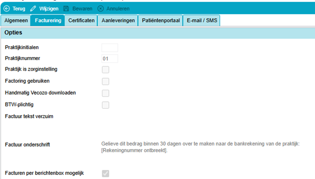 Als je de Berichtenbox niet wilt gebruiken, dan pas je dit aan via Instellingen > Praktijkinstellingen > Facturering  > Wijzigen > Vinkje uit bij ‘Facturen per berichtenbox mogelijk.