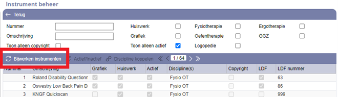 Om de actuele meetinstrumenten te kunnen zien, moet in Incura de lijst van bekende instrumenten worden bijgewerkt. De beheerder van je Incura-omgeving kan dat voor je doen, mogelijk ben je dat natuurlijk zelf. Ga hiervoor naar Dashboard > Beheer > Instrumentbeheer, en kies voor de functie ‘Bijwerken instrumenten’ (zie schermfragment).