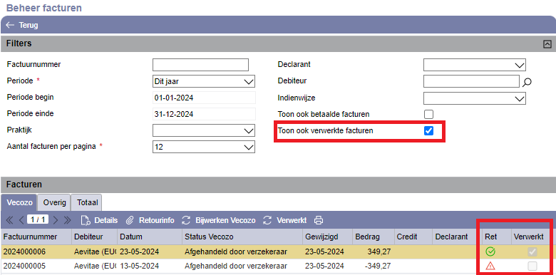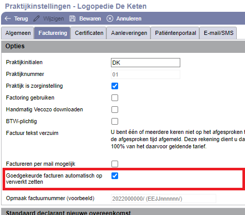 In ‘Beheer facturen’ kun je snel zien welk van je ingediende facturen door de betreffende verzekeraar zijn goed- of afgekeurd. Wil je nog gerichter werken, en standaard alleen de facturen zien die nog verdere aandacht nodig hebben? Schakel dan de praktijkinstelling in waarmee goedgekeurde facturen direct het vinkje ‘Verwerkt’ krijgen. Ga daarvoor naar Dashboard > Instellingen > Praktijkinstellingen > tab Facturering, klik op ‘Wijzigen’, kies voor de optie ‘Goedgekeurde facturen direct op verwerkt zetten’ en klik op ‘Bewaren’.