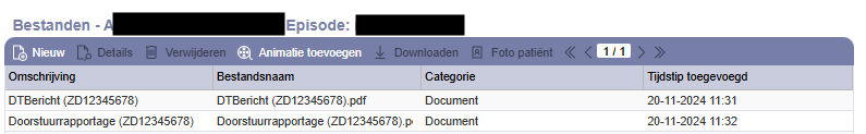 Vanaf deze release zal ook een afschrift van een DT Bericht of een Doorstuurrapportage, verstuurd via ZorgDomein, worden toegevoegd aan het dossier van de patiënt. Deze bestanden zijn te vinden onder “Bestanden” van de episode.