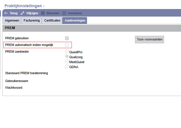 Een andere manier om zo veel mogelijk patiënten te bereiken met een PREM is om het vinkje ‘Automatisch PREM aanleveren” (tijdelijk) aan te zetten via Instellingen > Praktijkinstellingen > Aanleveringen. Klik eerst op Wijzigen om het vinkje aan te kunnen zetten.